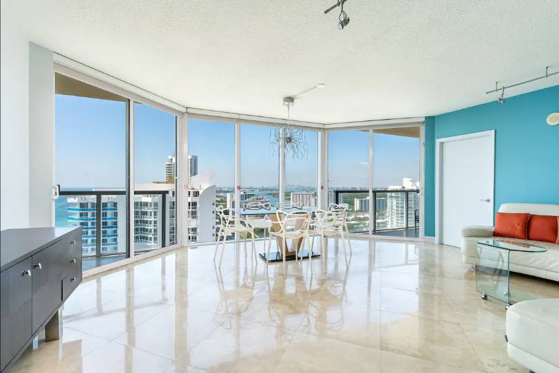 Designer decorated, fully furnished modern corner oceanfront residence. Come relax & unwind with sunrise ocean views & a wraparound terrace that offers amazing sunset views. Floor to ceiling windows throughout truly make this spacious 1423 sq/ft apartment have a very open feel. Marble tile, granite kitchen, brand new A/C unit, & custom LED lighting. Endless ocean, intracoastal, & downtown Miami views – at night it’s surreal! Towels, linens, and kitchen cooking equipment are all provided.