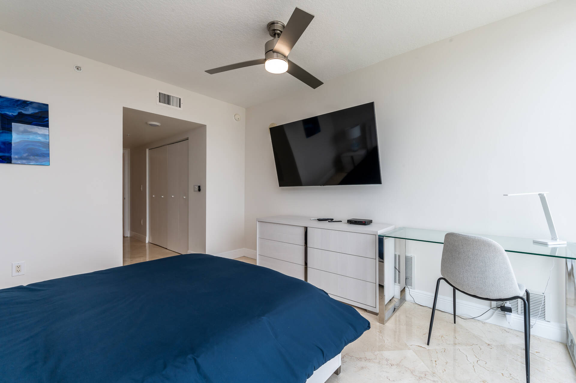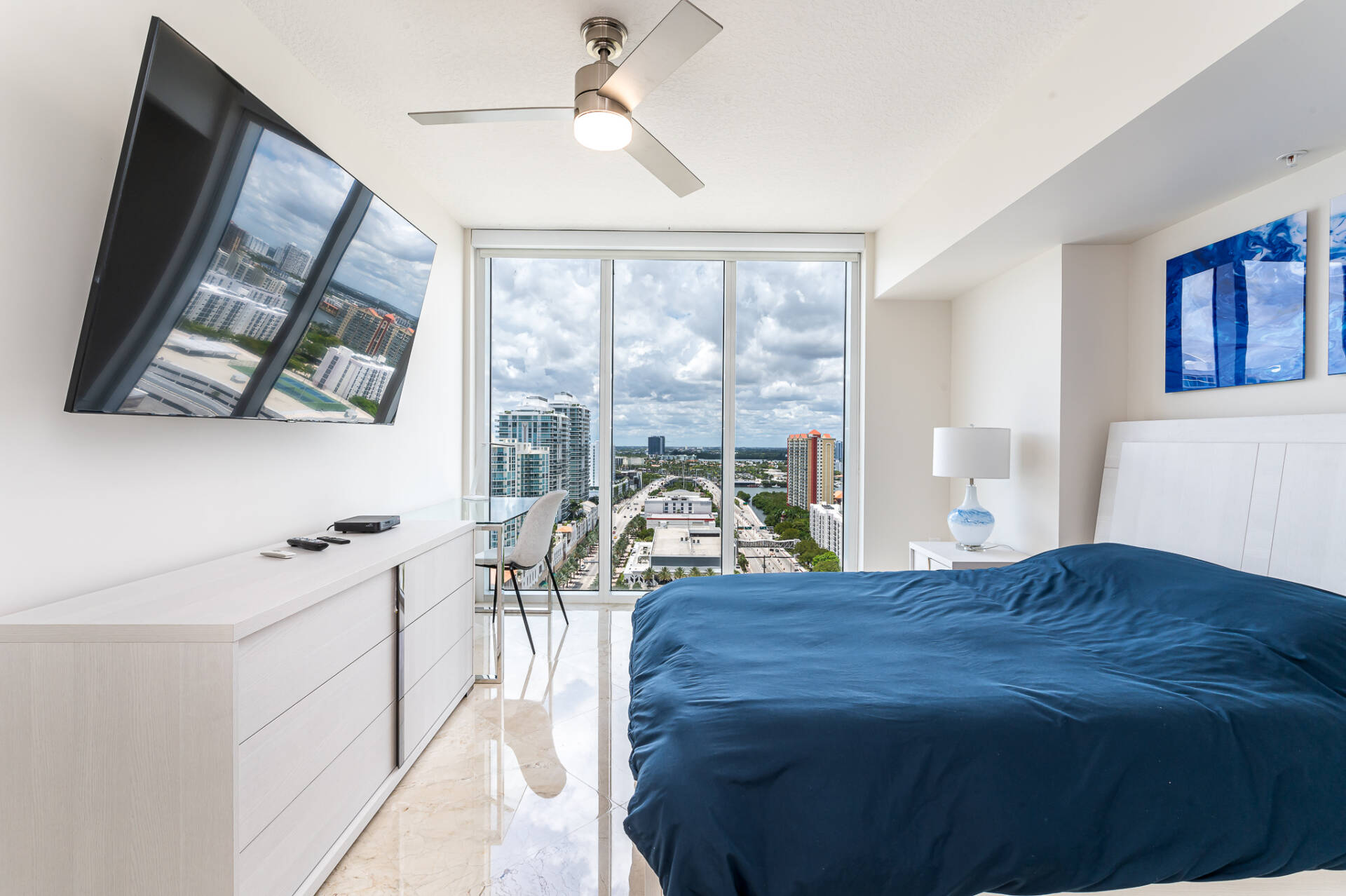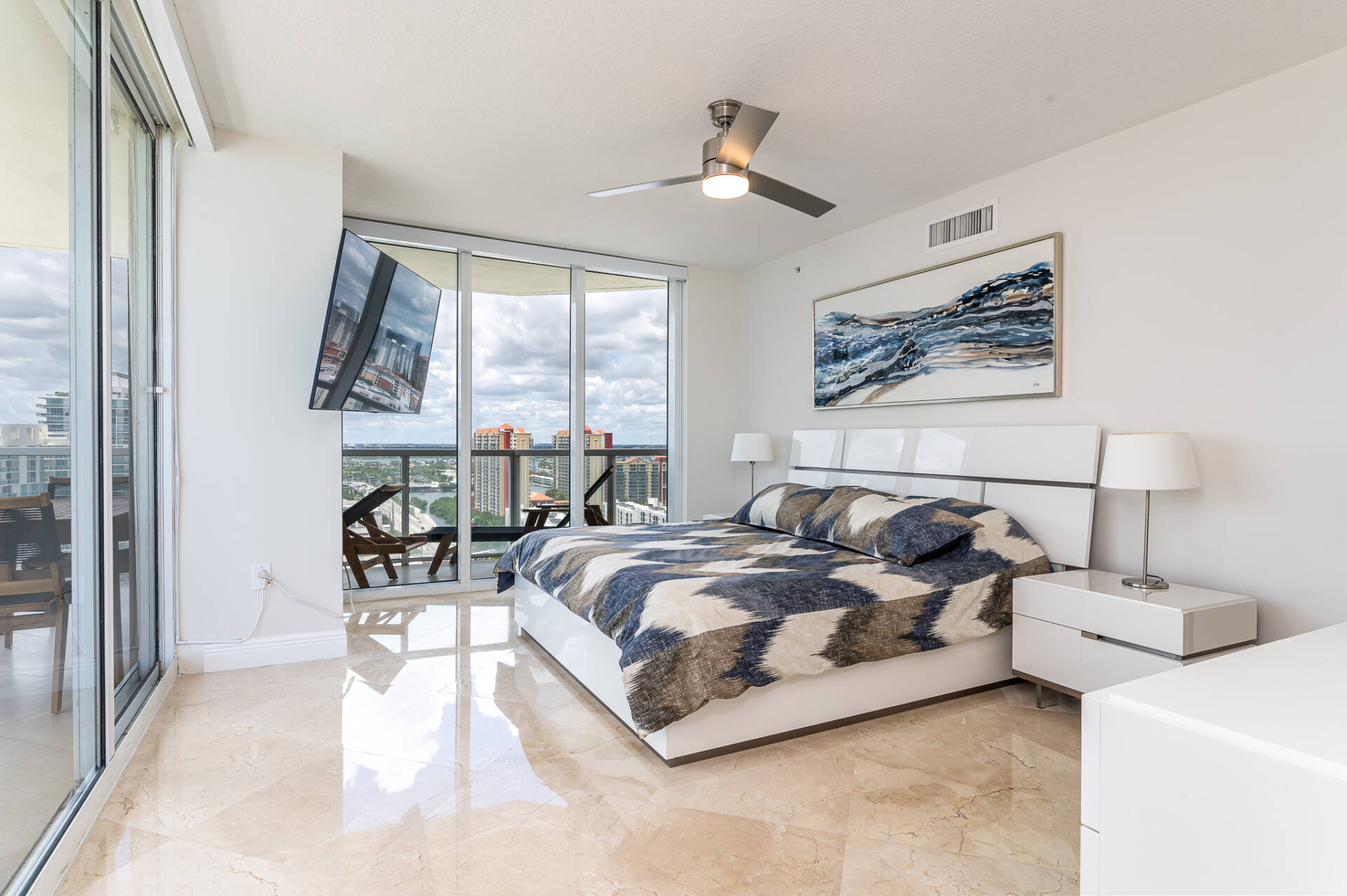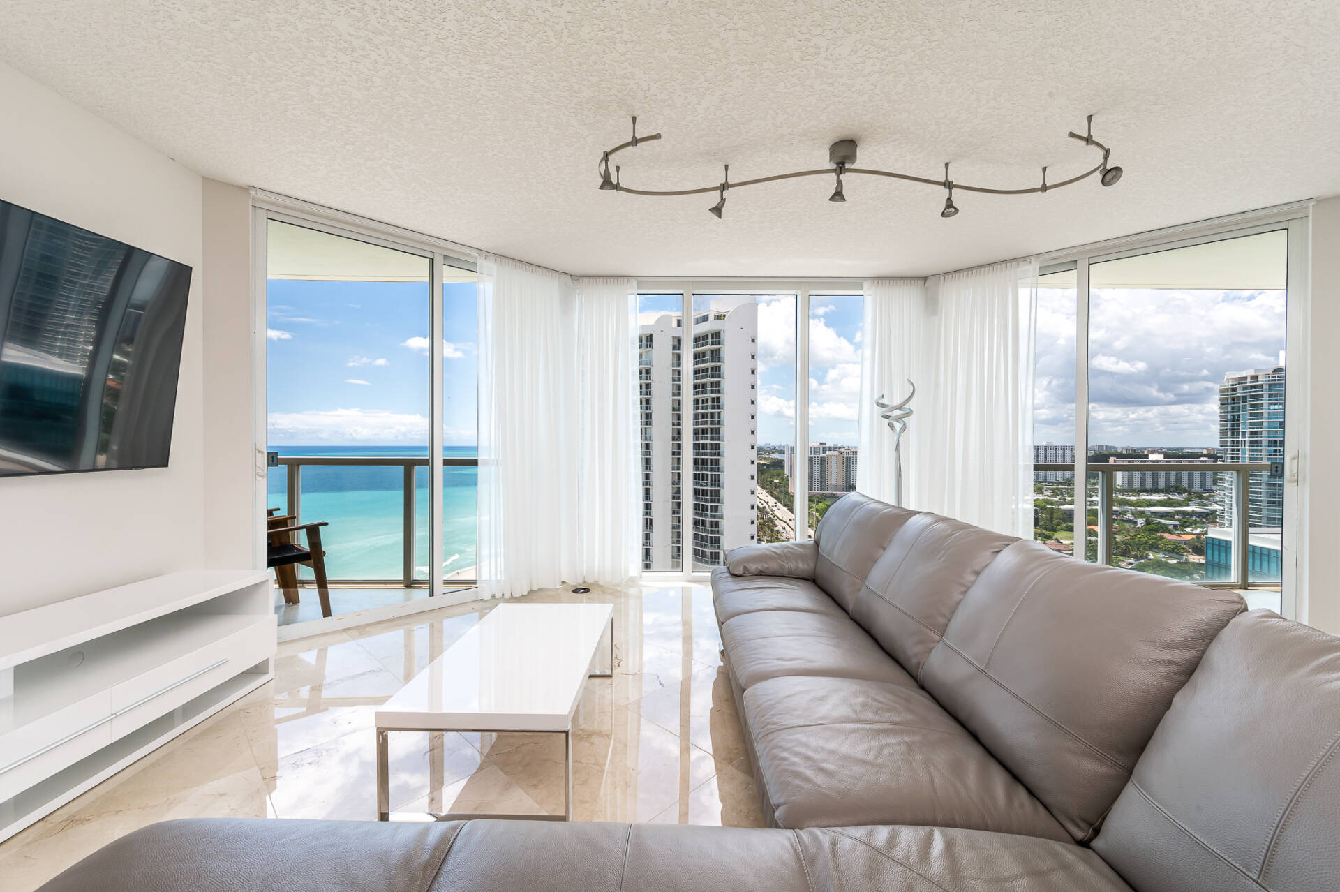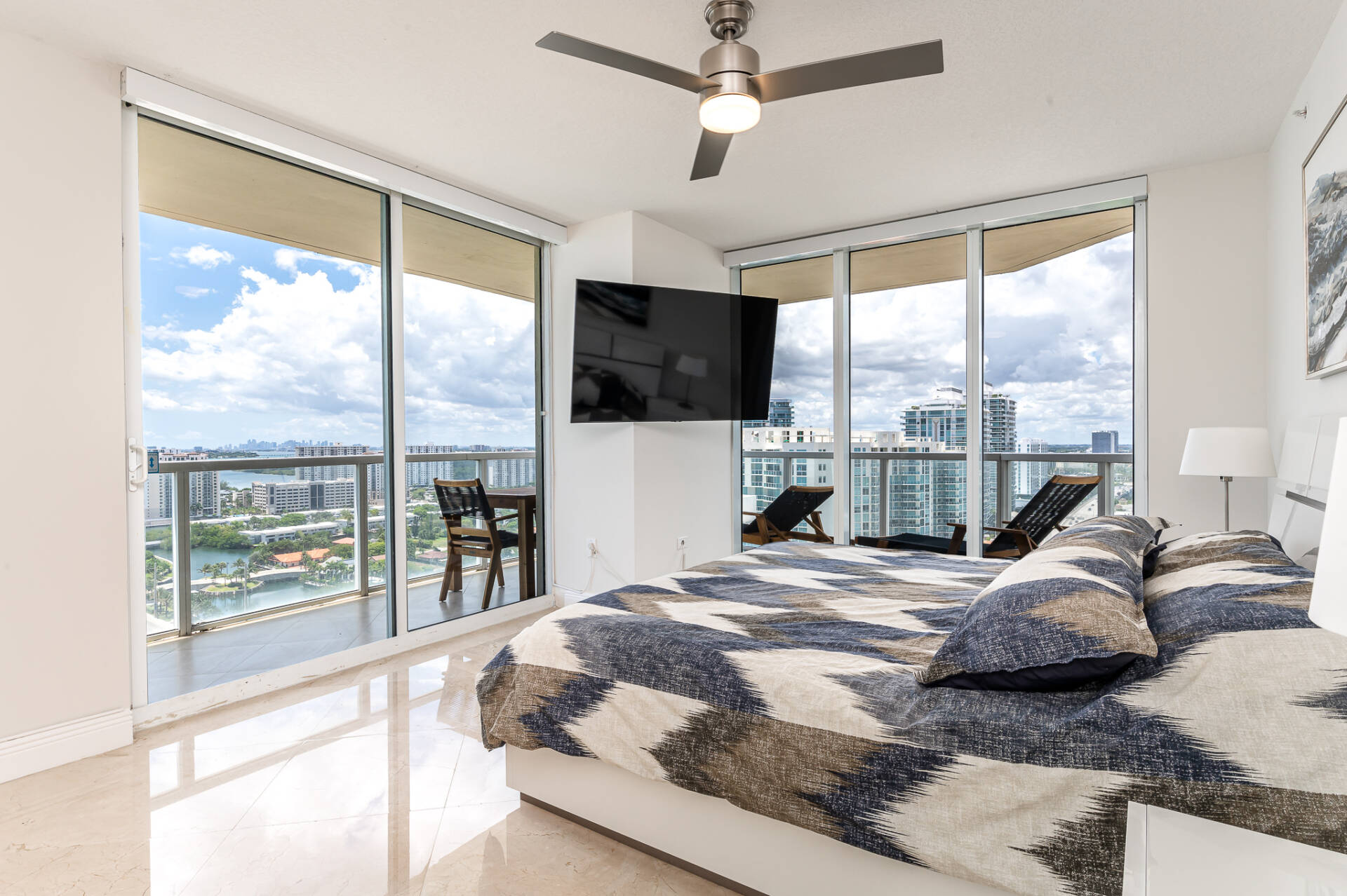 Amazing corner unit with floor to ceiling windows! Ocean, city, & intracoastal views! Split floor plan, 2 bed-2 bath & 1423 sq/ft plus a HUGE wraparound patio with lounge chairs & a dining table. Modern decor & marble floors. All smart TVs – 75″ in living room & 55″ in the bedrooms. Master bedroom has a king bed, electric blackout blinds, & a walk in closet. Master bath – stand up shower, large jacuzzi tub, & dual sinks. Second bedroom has queen bed & a desk. Washer/dryer in the unit.
